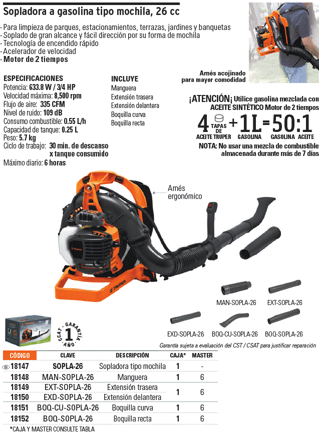 Utilice gasolina mezclada con aceite sintético para motor de 2 tiempos con relación 50:1