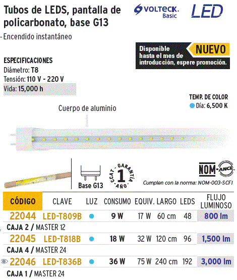 Tubo de LED T8, 36 W, 2.4 m, Volteck Basic
