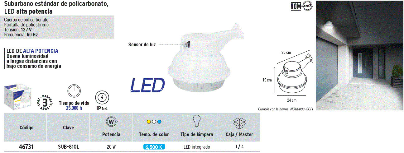 Luminario suburbano de LED 20 W con sensor de luz, Volteck
