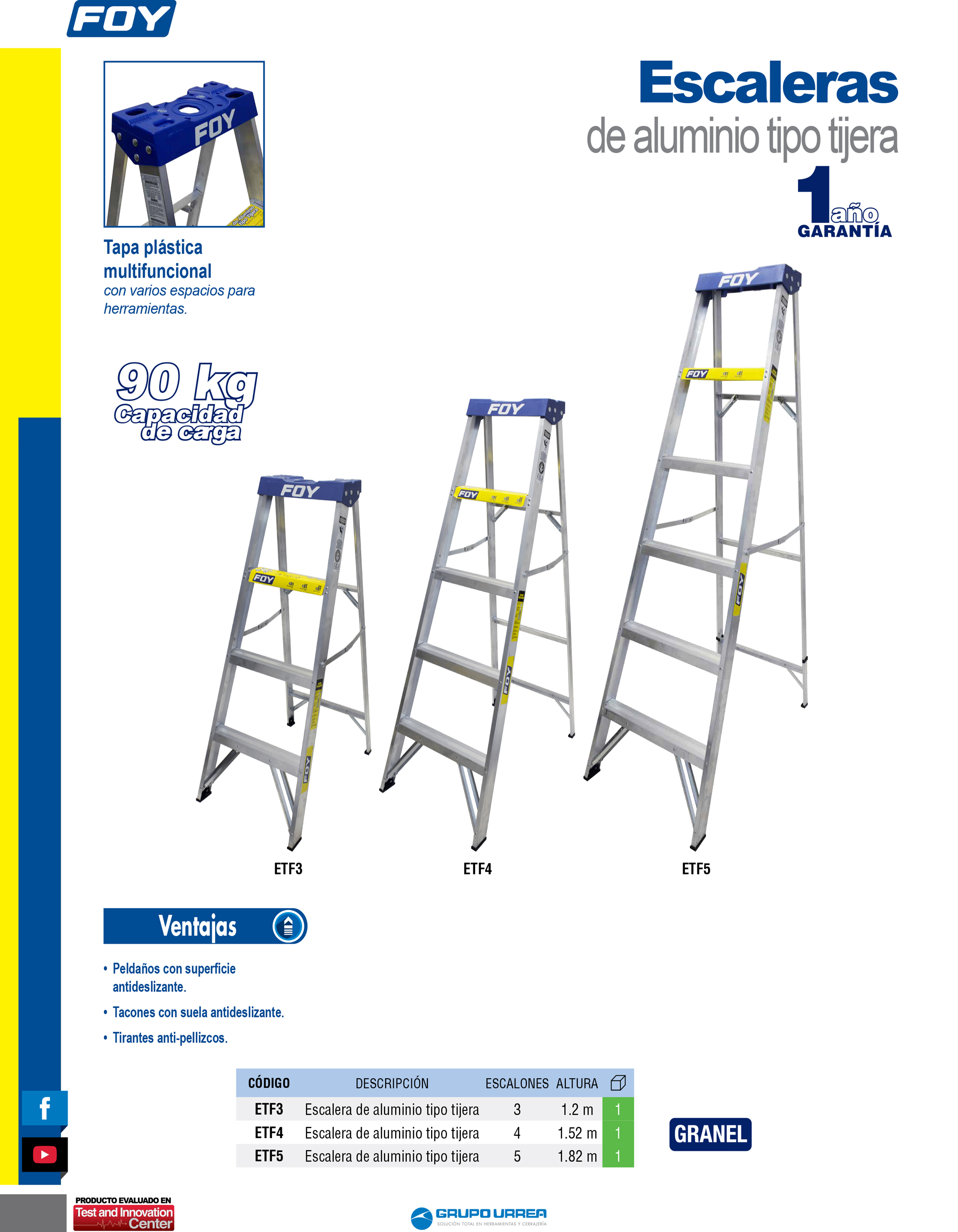 Escalera de tijera tipo III de aluminio y tapa plástica con 3 peldaños Foy