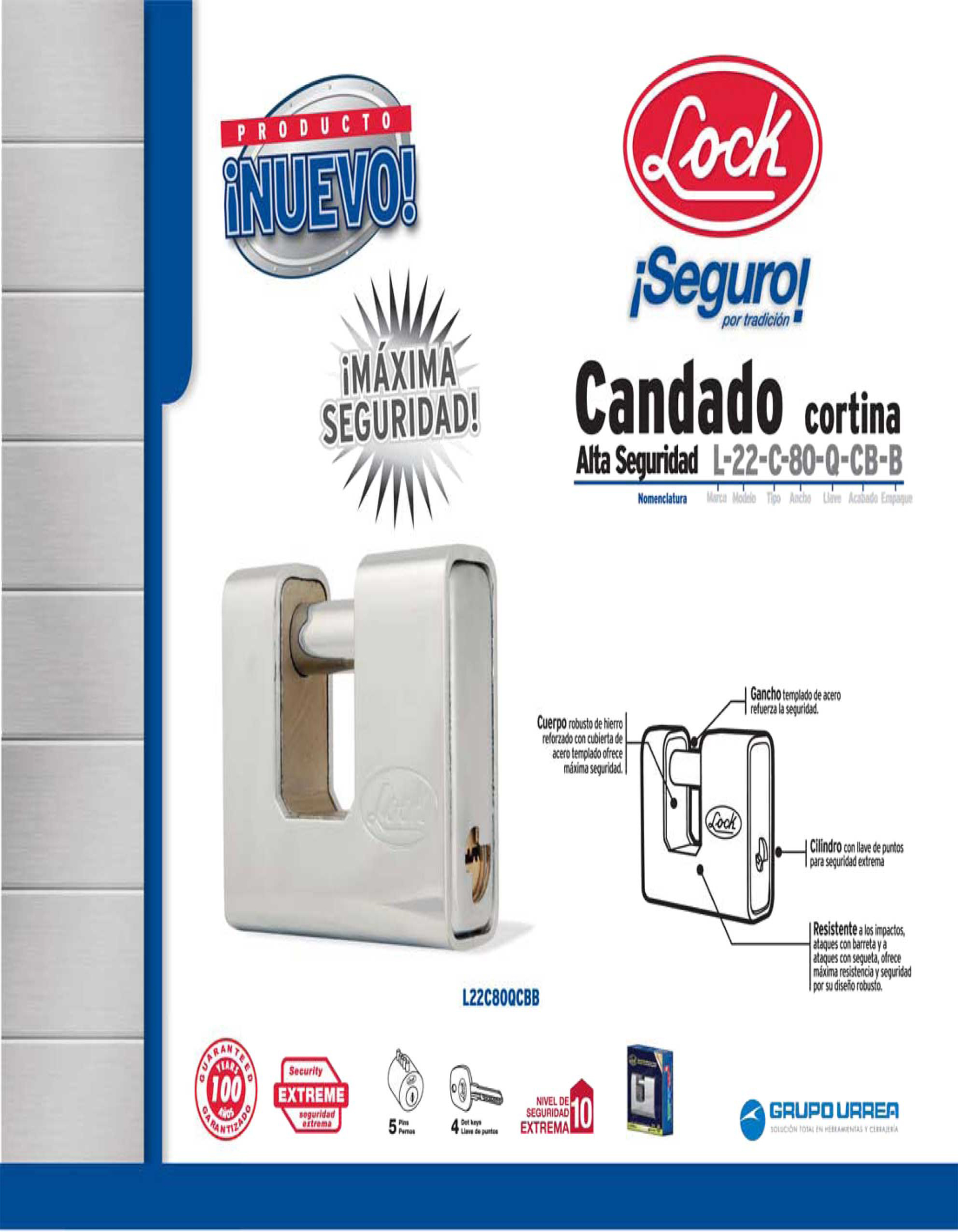 Candado de acero para cortina metálica 80 mm, niquel satinado, llave de puntos Lock