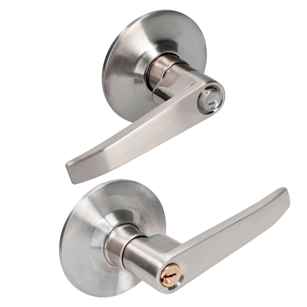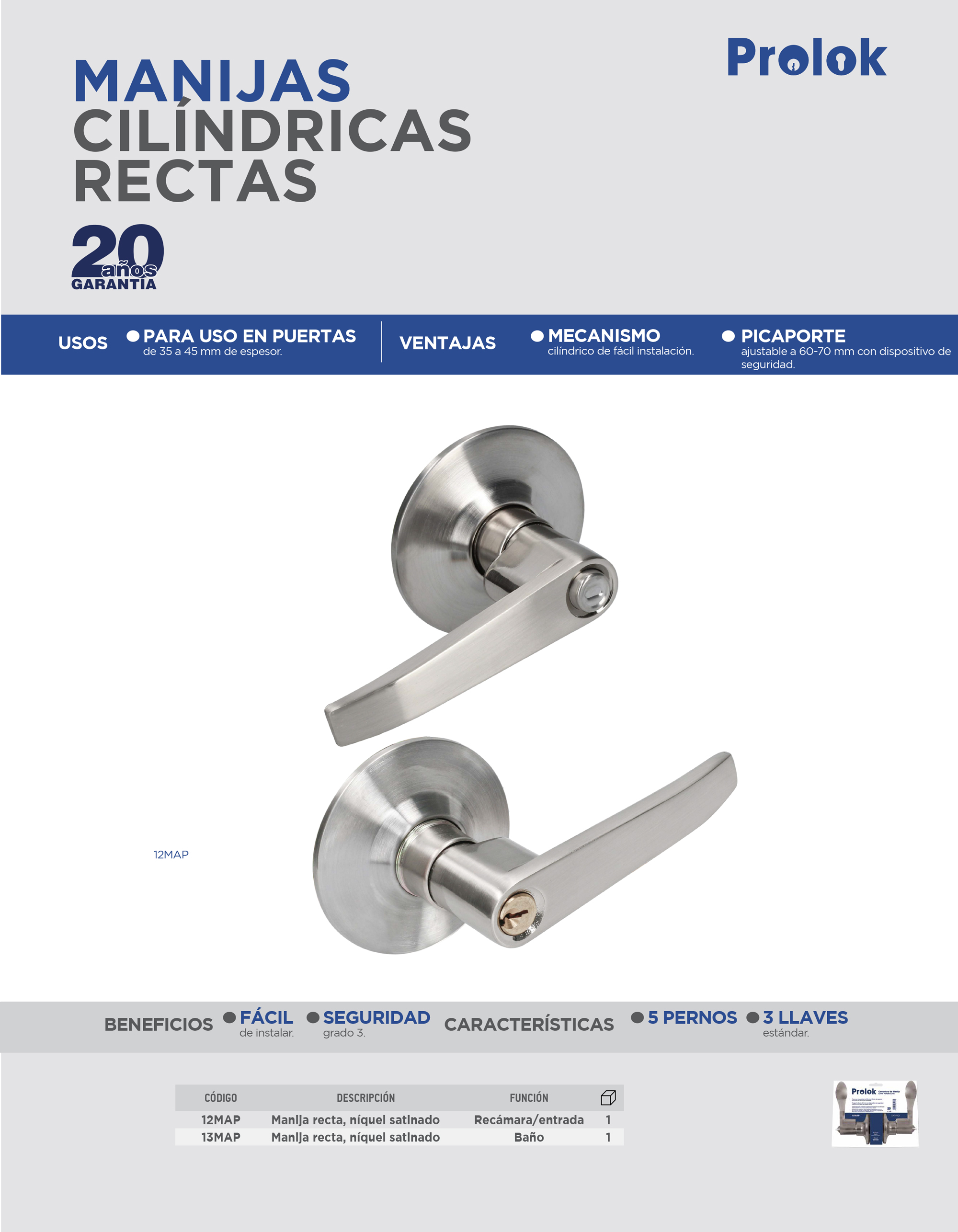 Manija cilíndrica recta función baño, níquel satinado, llave estándar, blíster Prolok