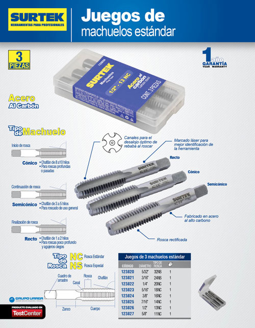 Juego de machuelos de acero al carbón 1/4"-20NC, 3 piezas Surtek