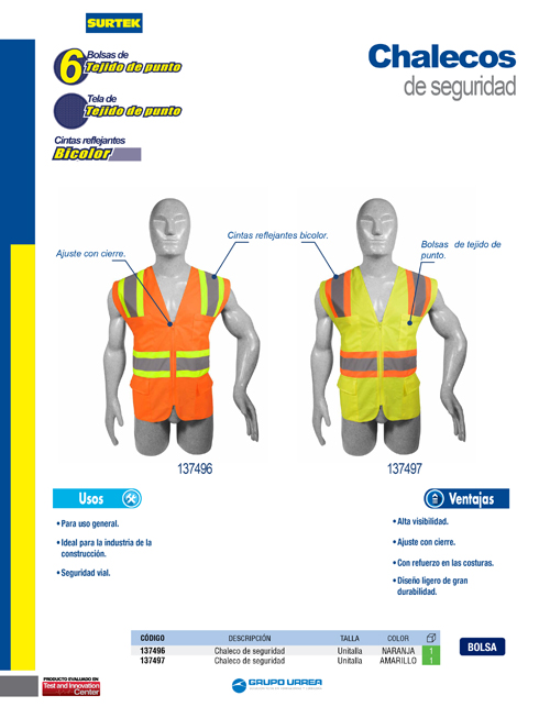 Chaleco de seguridad de alta visibilidad con cierre y 6 bolsas amarillo unitalla Surtek
