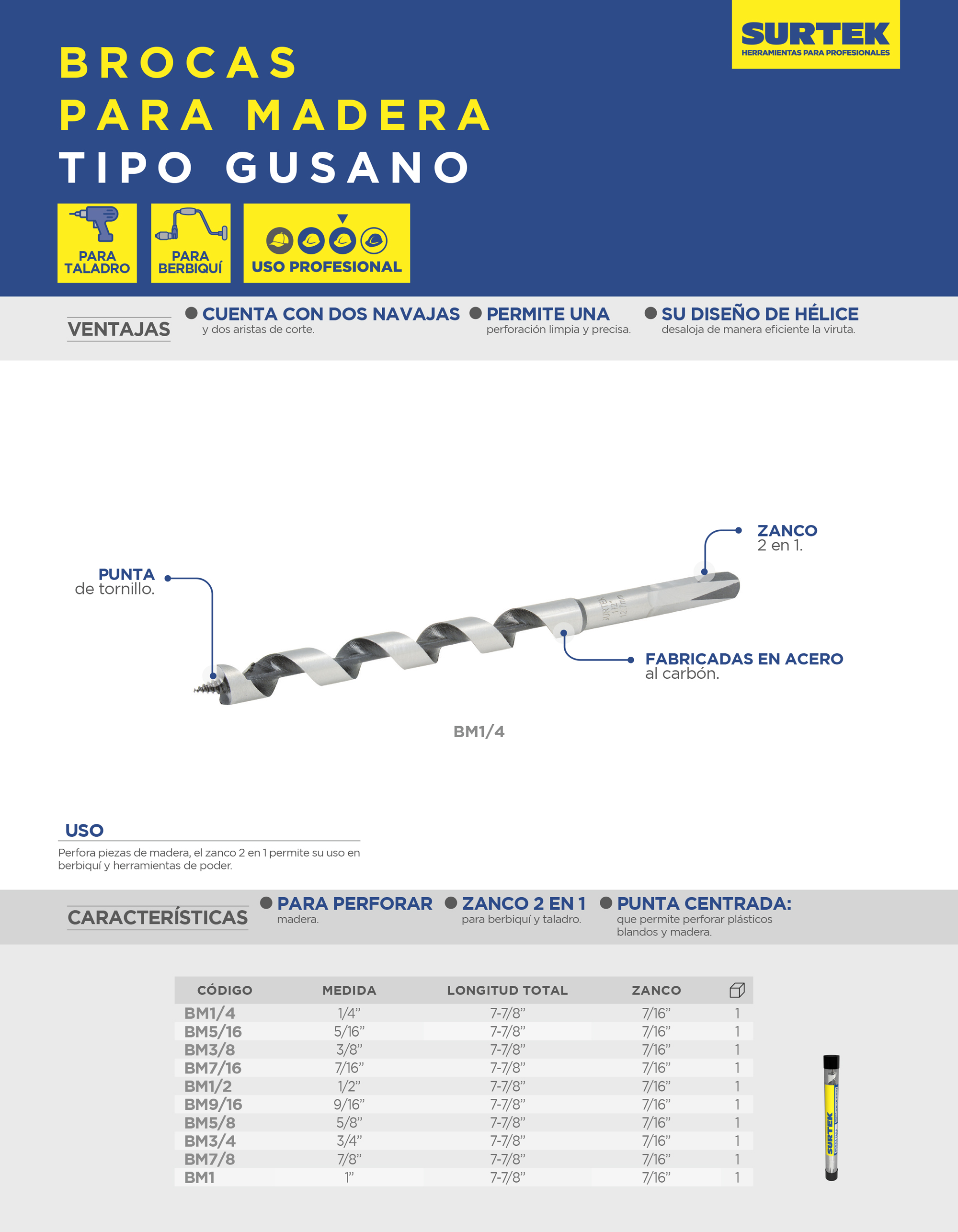 Broca para madera de acero al carbono tipo gusano 1" zanco 2 en 1 Surtek