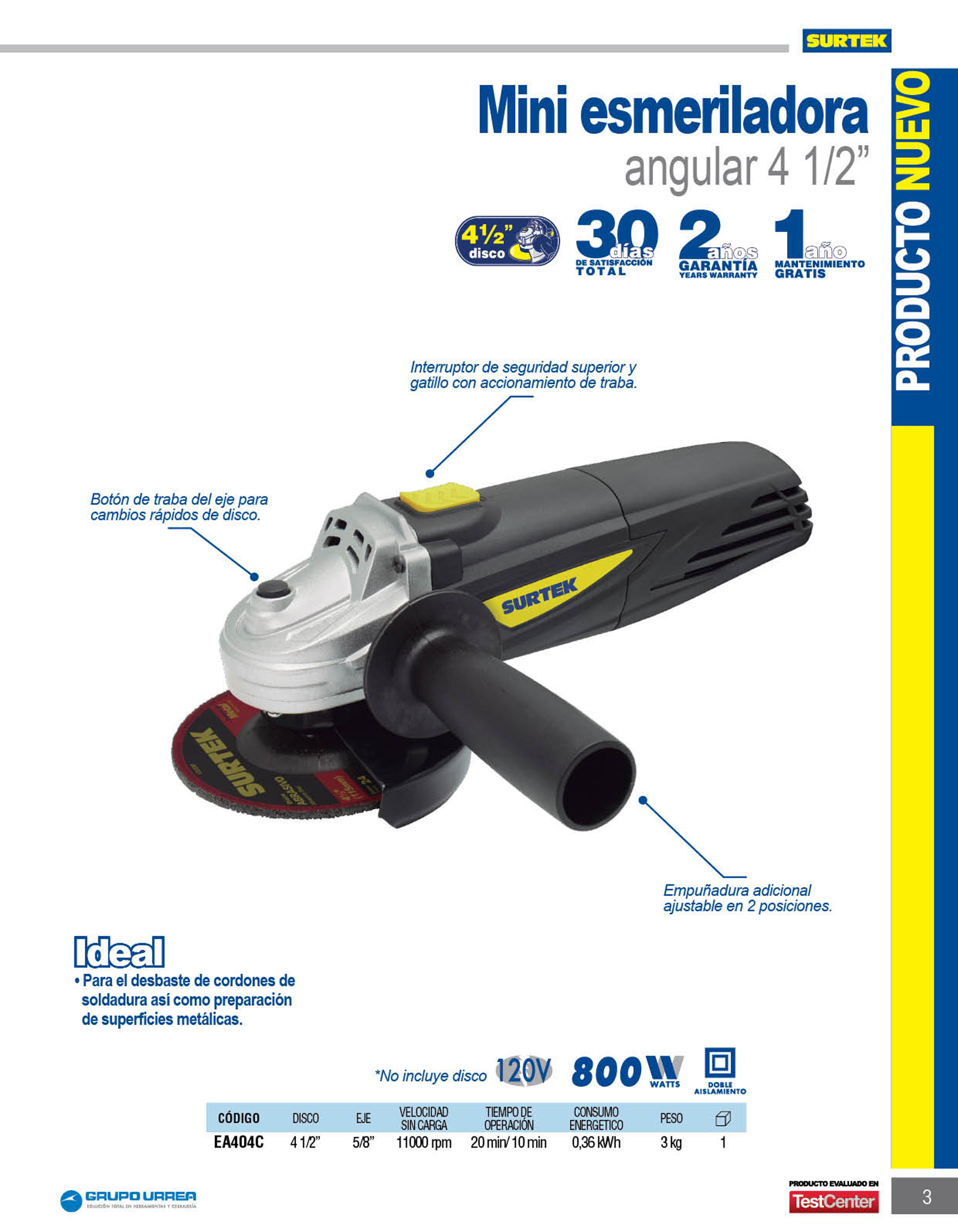 Mini esmeriladora angular 4-1/2" 800 W 120 V, 11000 RPM Surtek