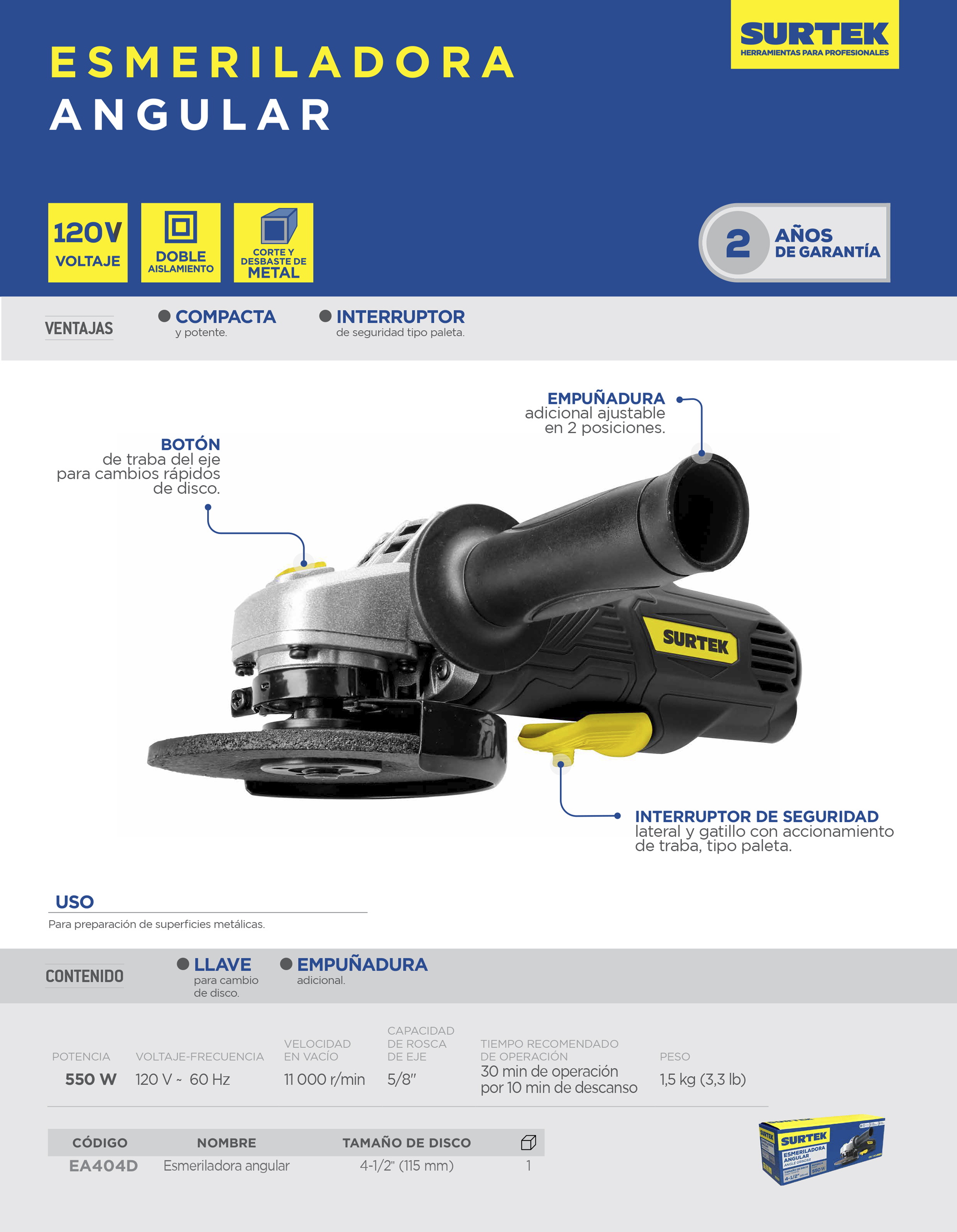 Mini esmeriladora angular 4-1/2" 550 W 120 V, 11000 RPM Surtek