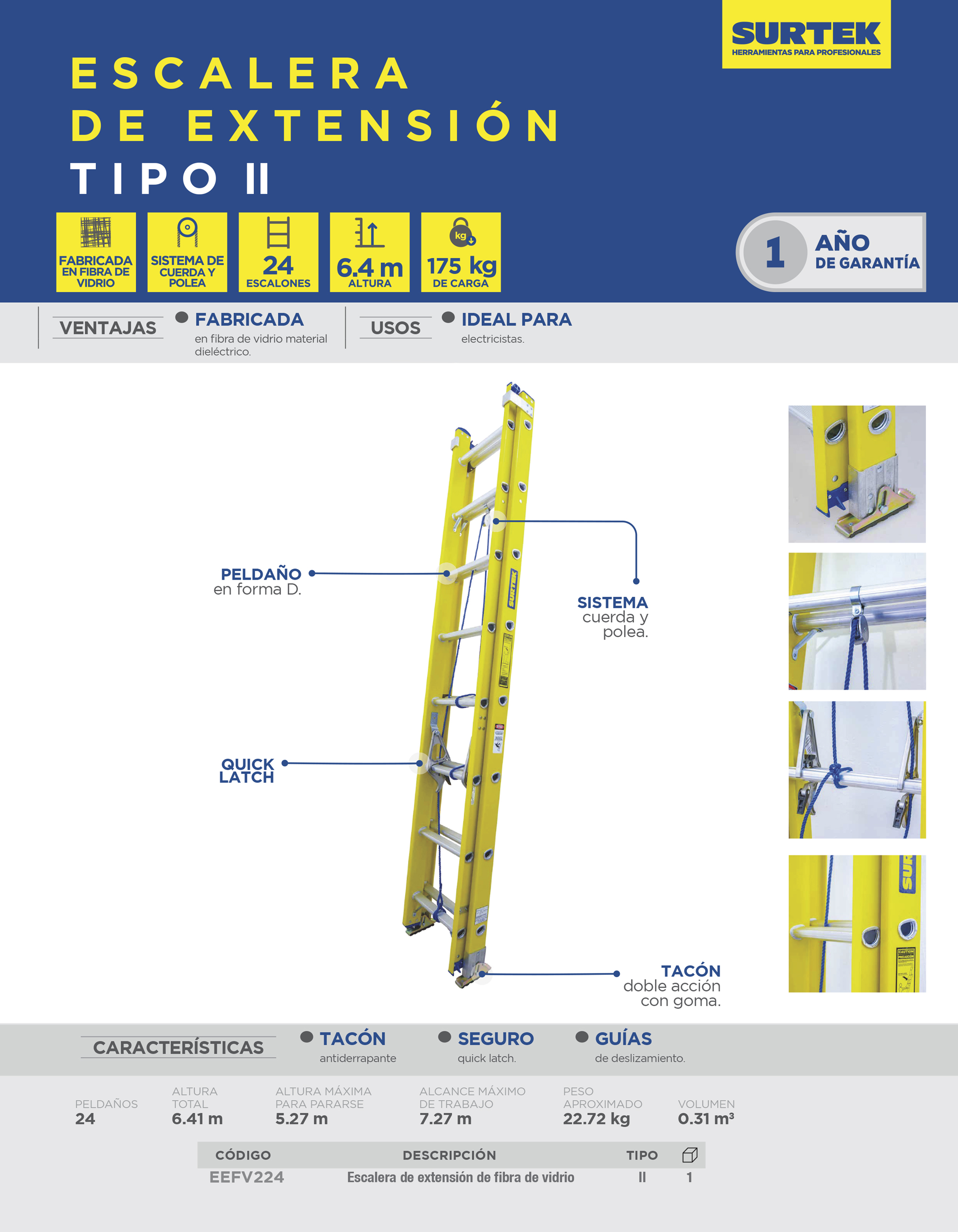 Escalera de extensión tipo II de fibra de vidrio con 24 peldaños Surtek