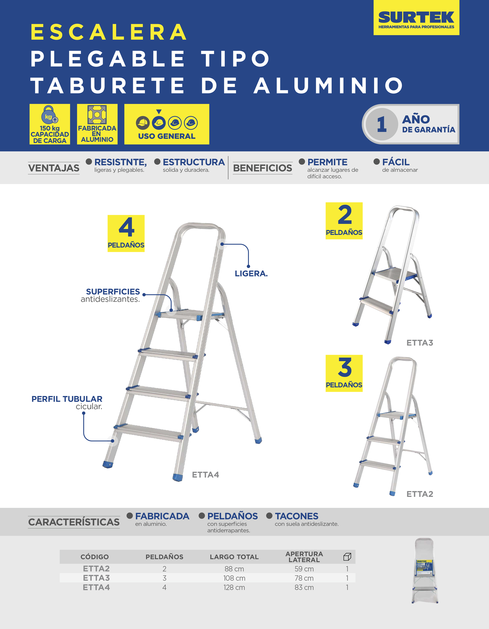 Escalera plegables tipo taburete de aluminio con 3 peldaños Surtek