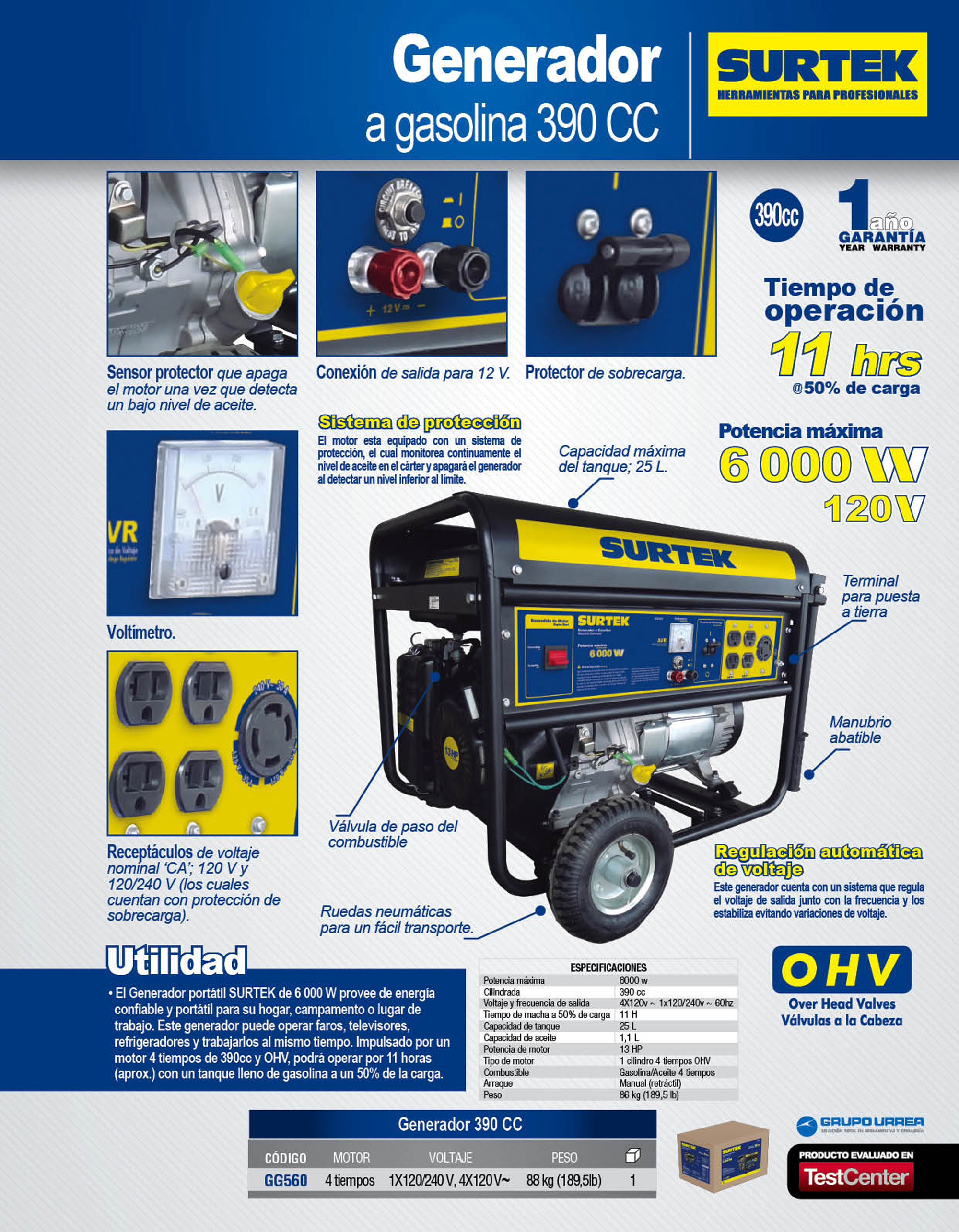 Generador a gasolina 6000 W, 390 cc, voltaje de salida 120 V Surtek