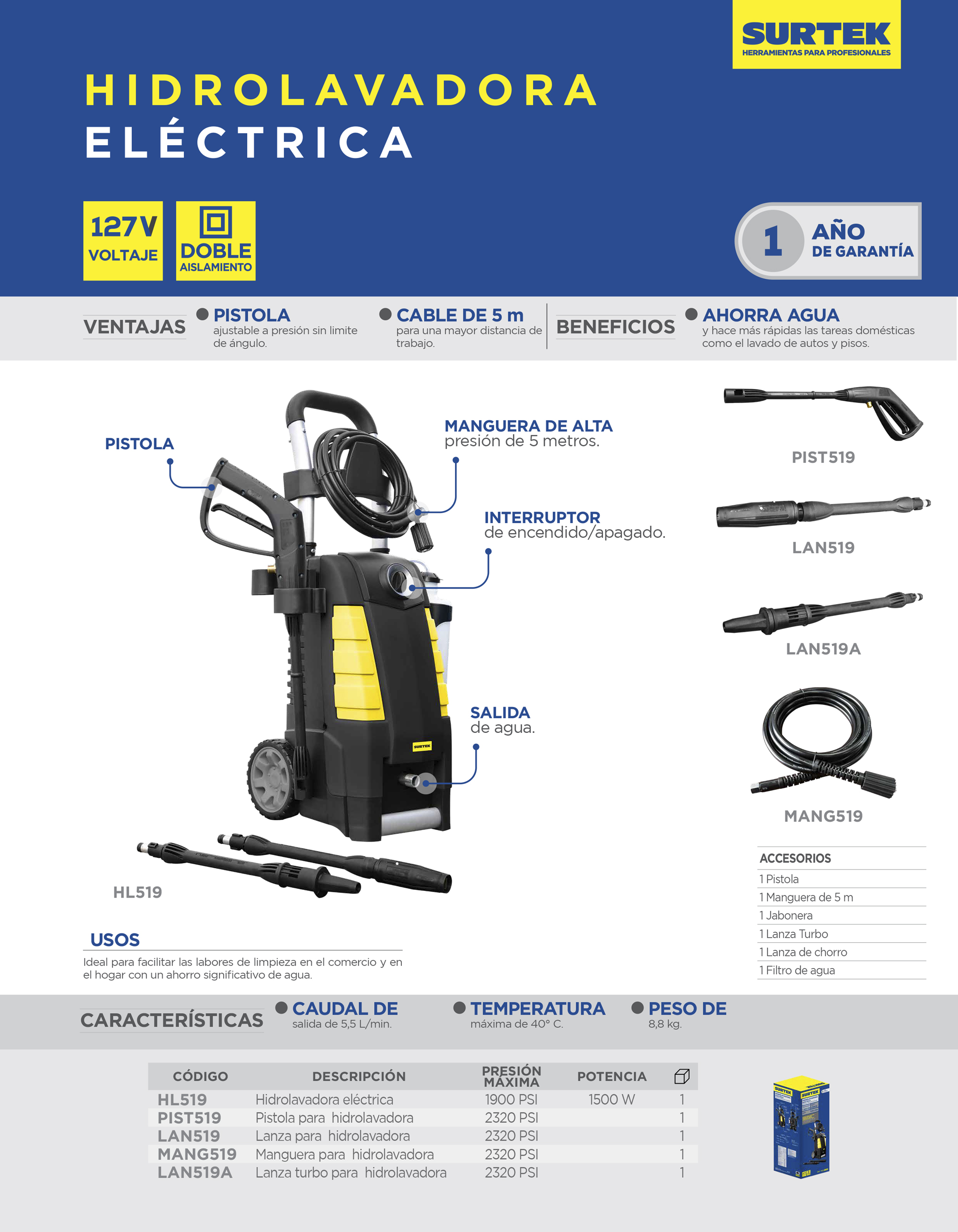 Hidrolavadora eléctrica 1500 W 127 V 1900 PSI, 5.5 Lt por minuto Surtek