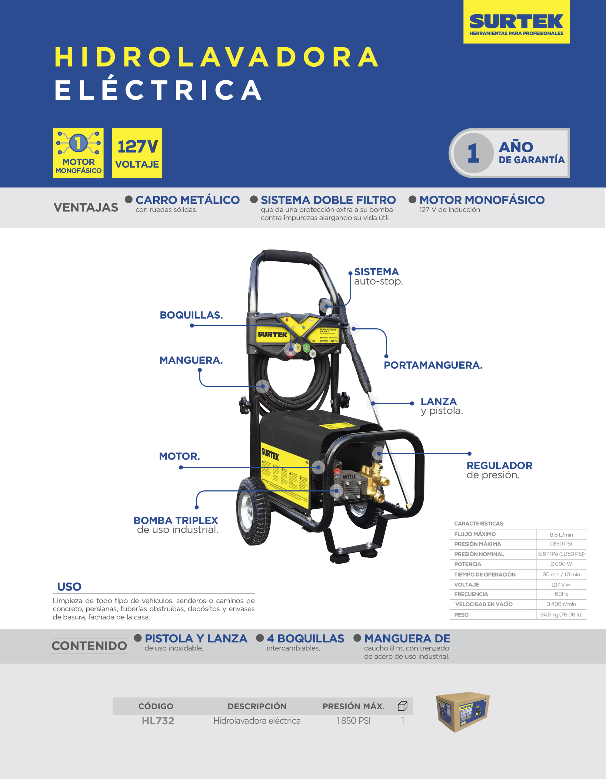 Hidrolavadora eléctrica 1400 W 127 V 1750 PSI, 5.5 Lt por minuto Surtek