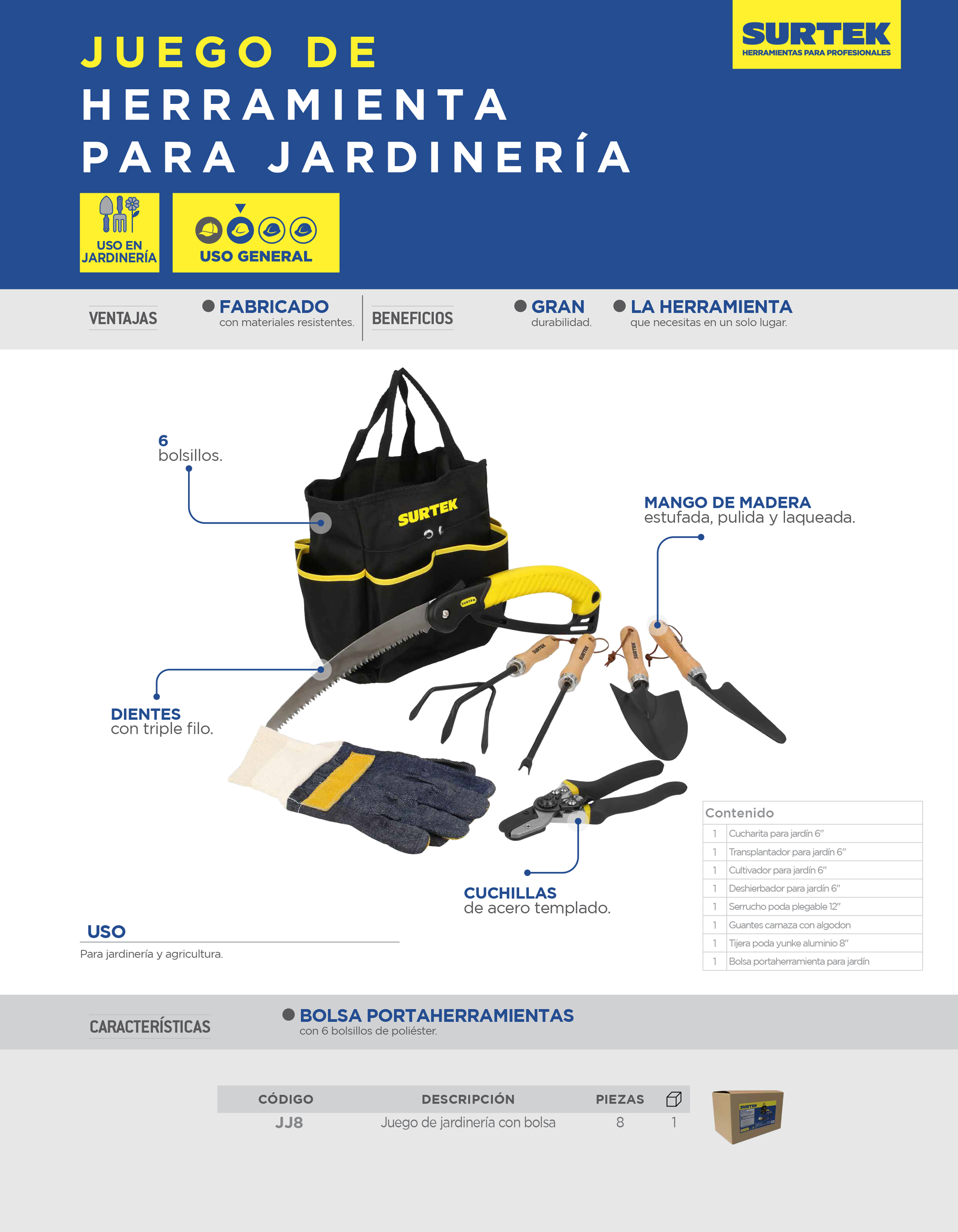 Juego combinado de herramienta para jardinería 8 piezas, con bolsa portaherramienta Surtek