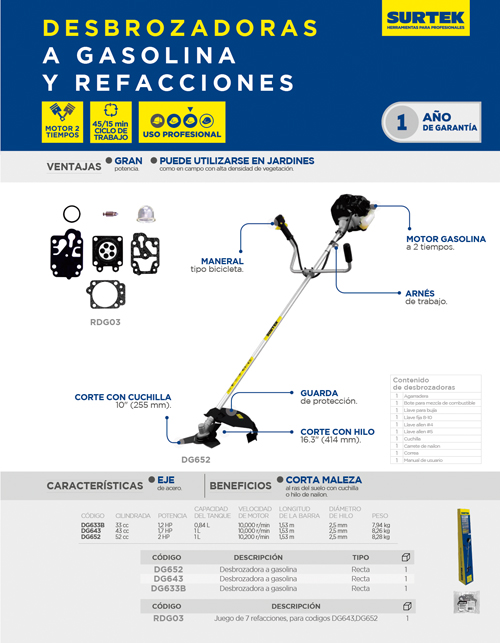 Juego de refacción para desbrozadora DG643, DG652, 7 piezas Surtek