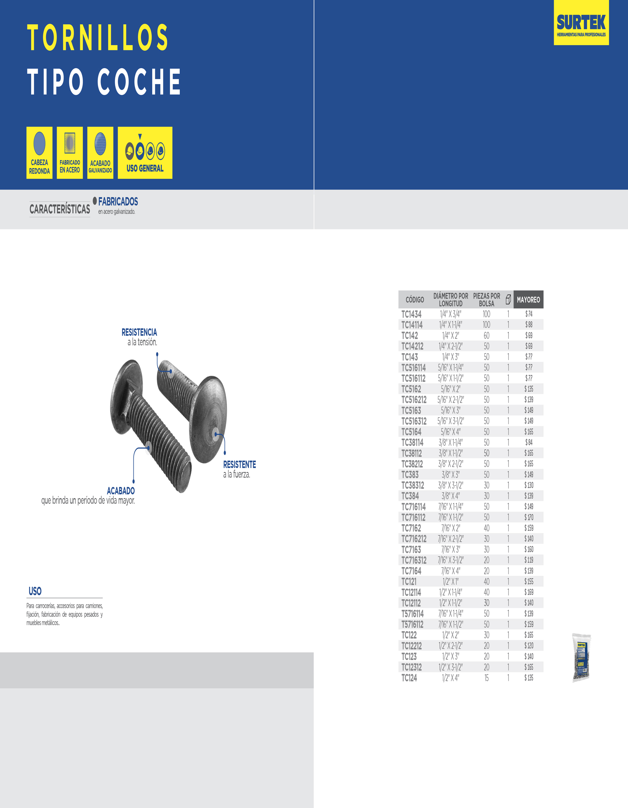 Tornillo tipo coche 7/16" x 2", 40 piezas Surtek