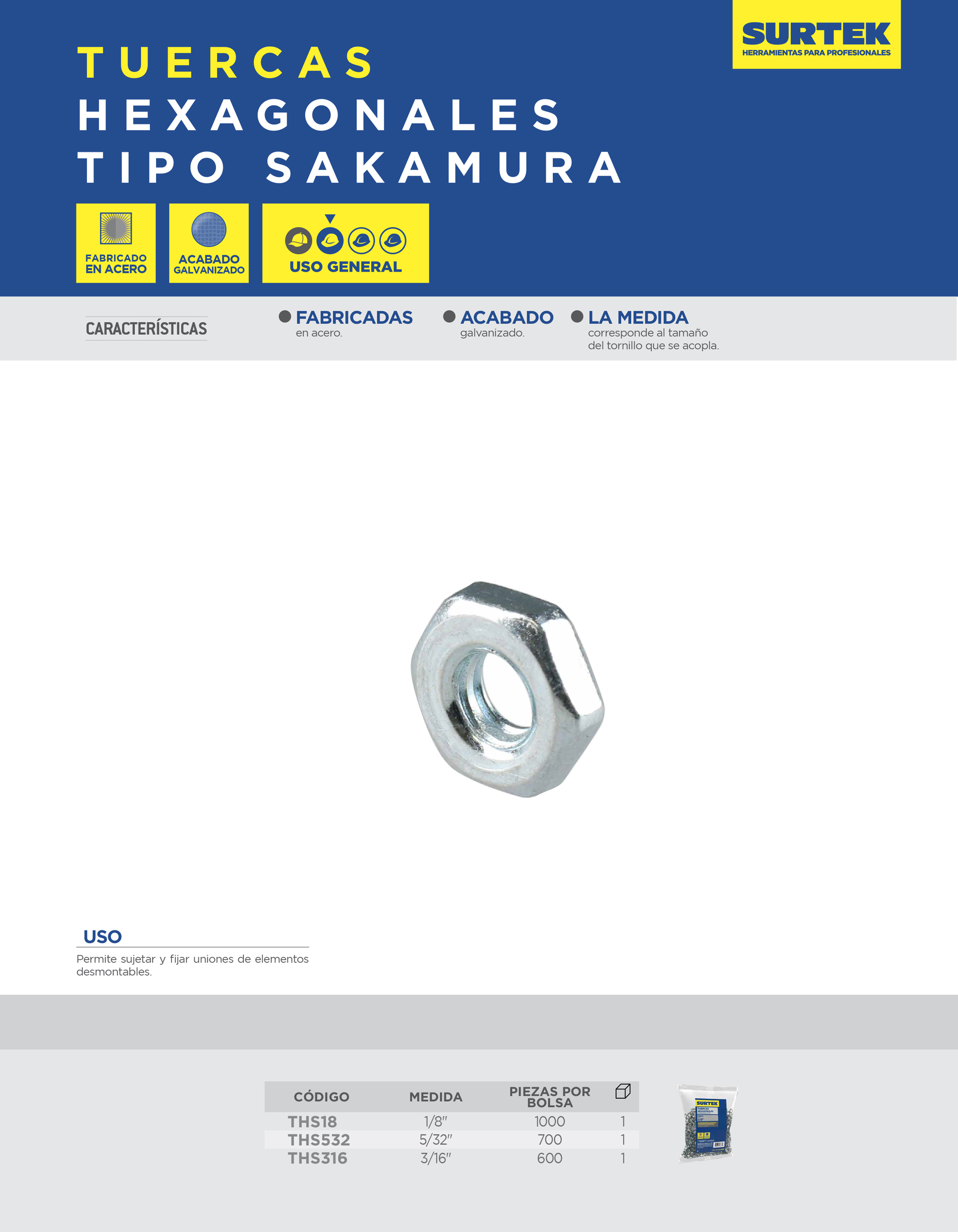 Tuerca hexagonal tipo sakamura 1/8", 1000 piezas Surtek