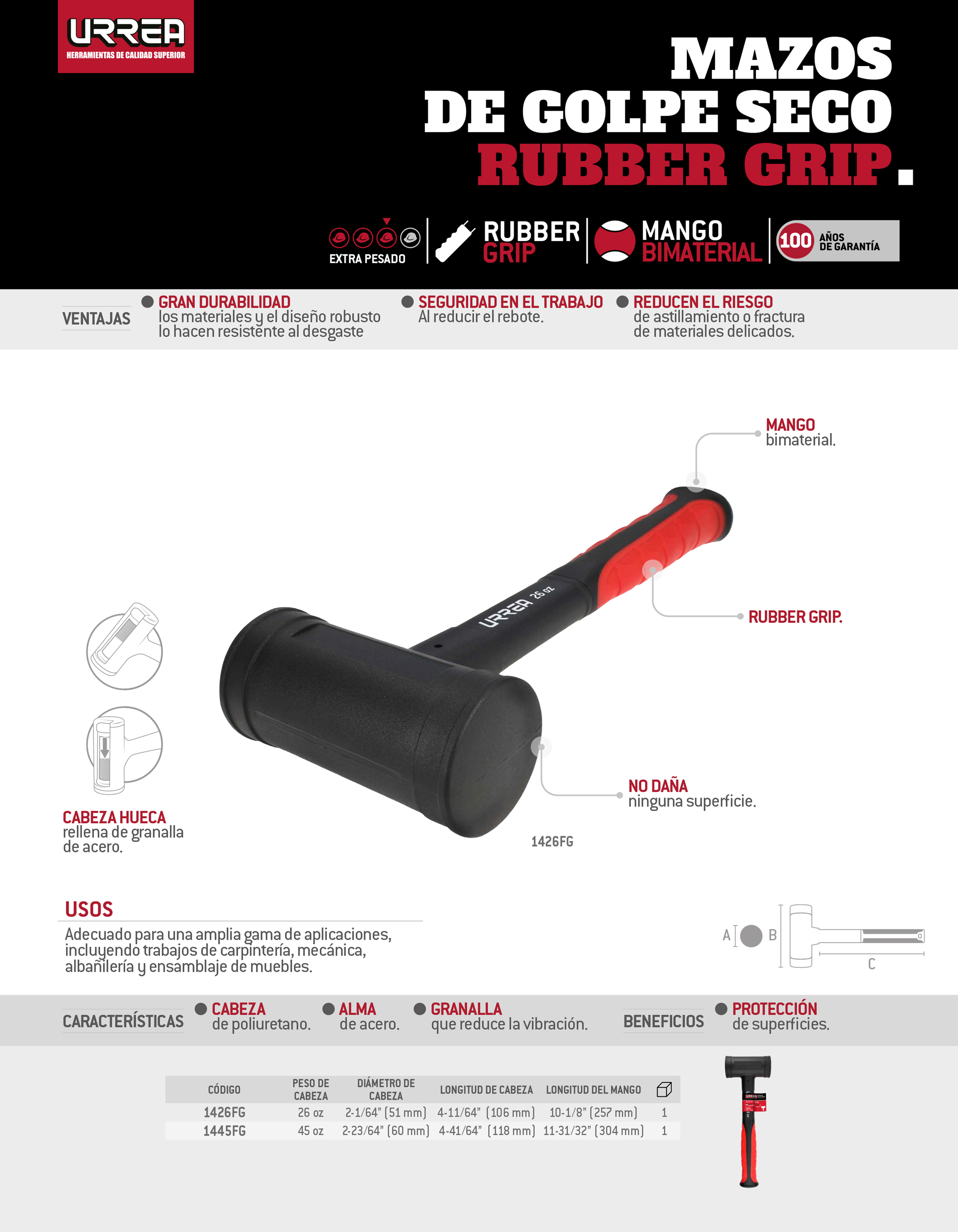 Mazo de golpe seco tapas fijas con mango Rubber grip de 10-1/8", 26 oz Urrea