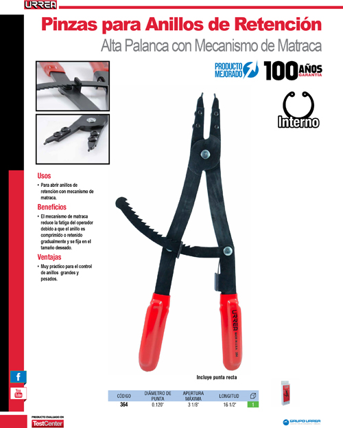 Pinza para cerrar anillos de retención con mecanismo de matraca Urrea
