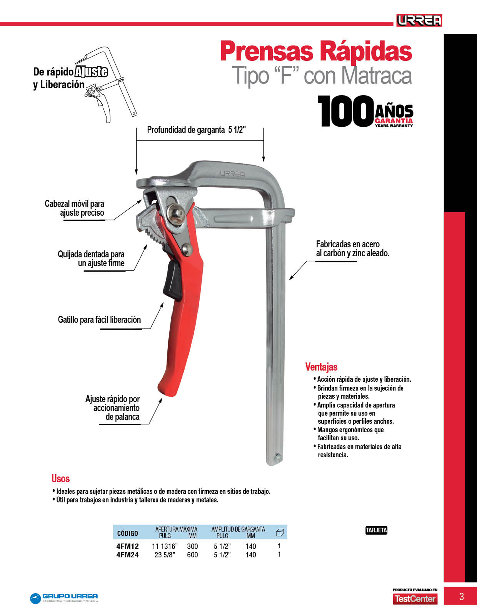 Prensa tipo "F" de 11-1/2" acero al carbón con sistema de matraca Urrea