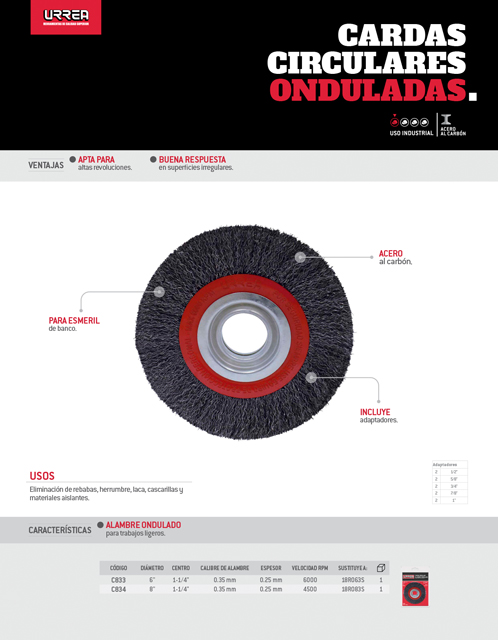 Carda circular ondulada alambre grueso para esmeril 8" x 0.35 mm multi eje Urrea