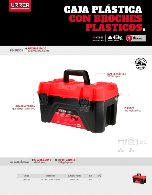 Caja portahta plástic con broches plásticos y charola ngo tapa rja 19"x10" Urrea