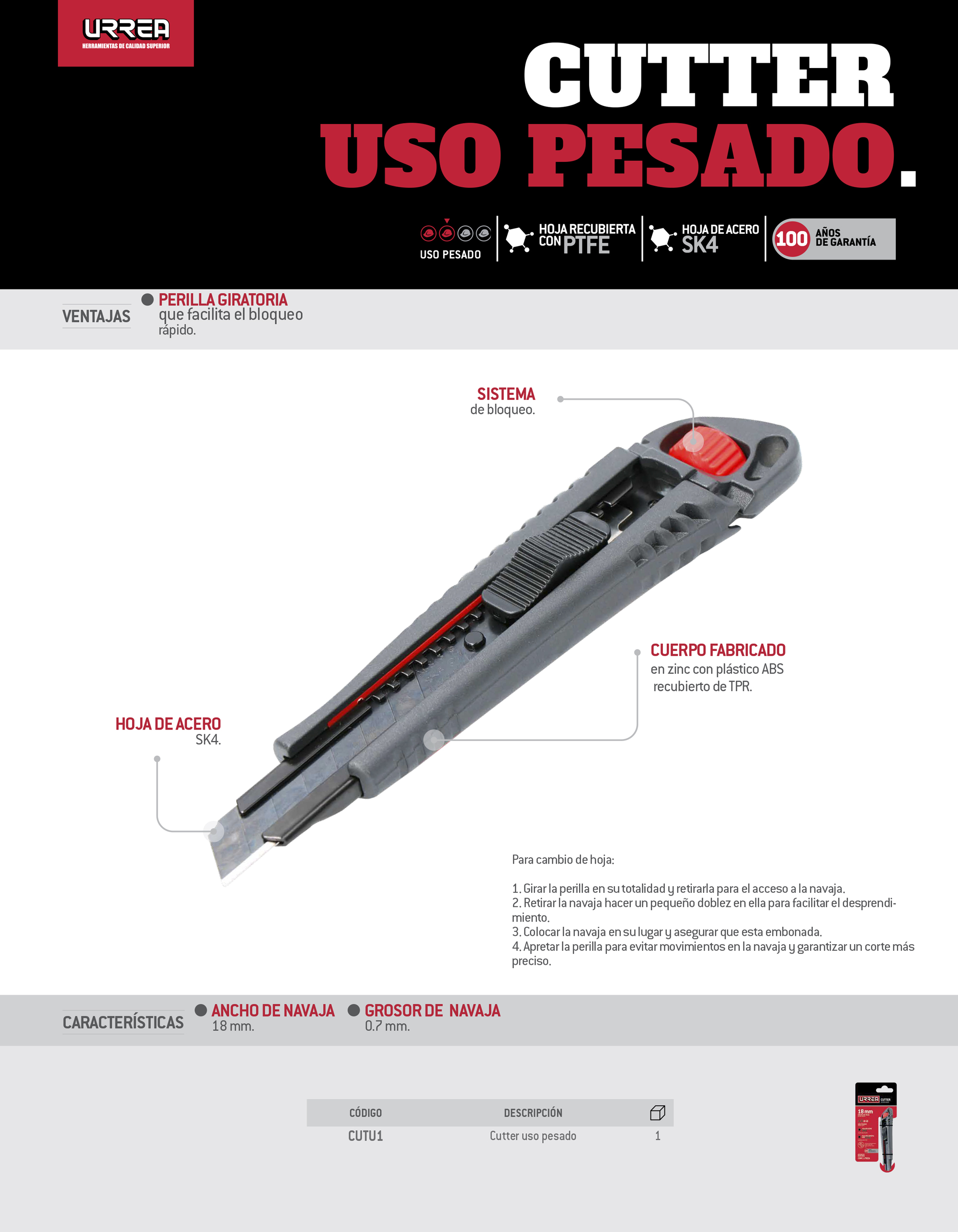 Cutter con cuerpo de acero de 18 mm, con hoja recubierta de PTFE Urrea