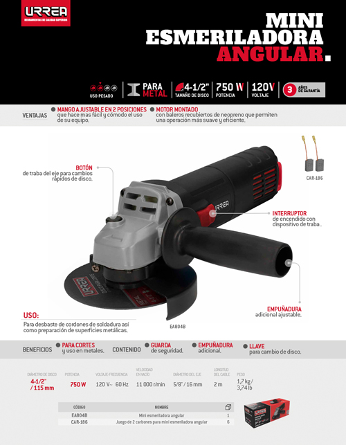 Mini esmeriladora angular 4-1/2" 750 W 120 V, 11000 RPM Urrea