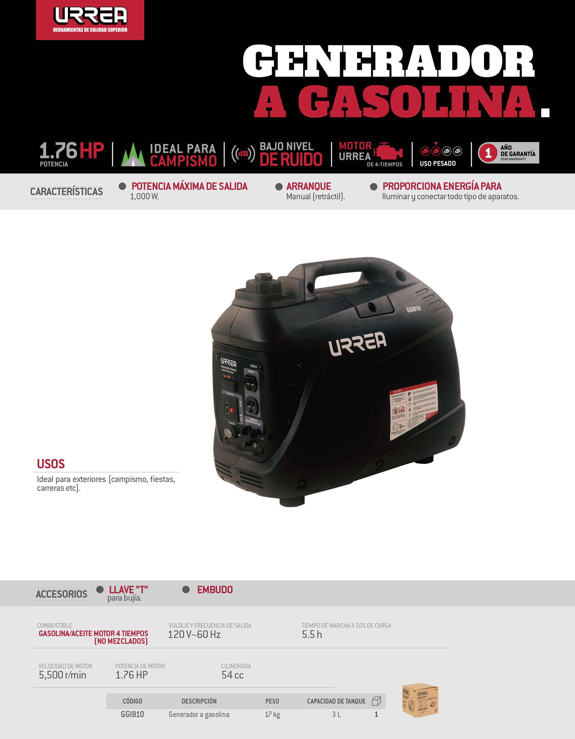Generador a gasolina inverter 1000 W, 54 cc, voltaje de salida 120 V Urrea