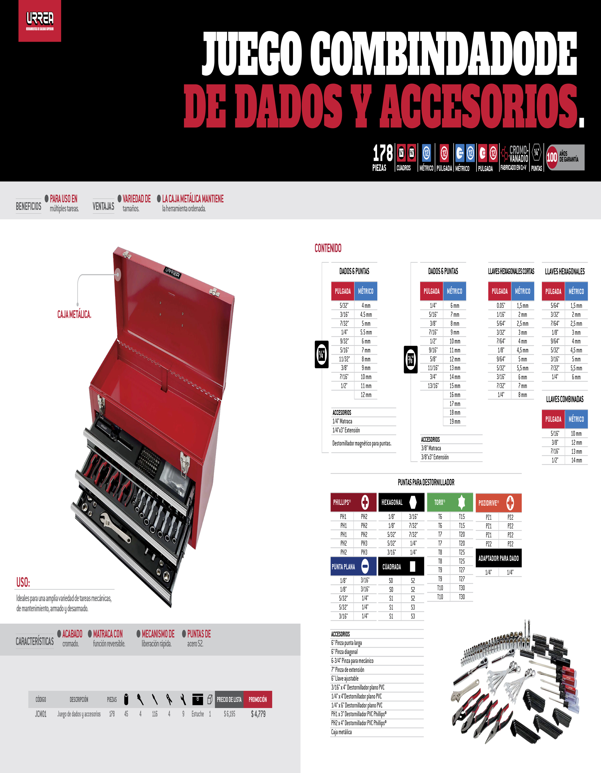 Juego combinado de herramienta 178 piezas, con caja metálica Urrea
