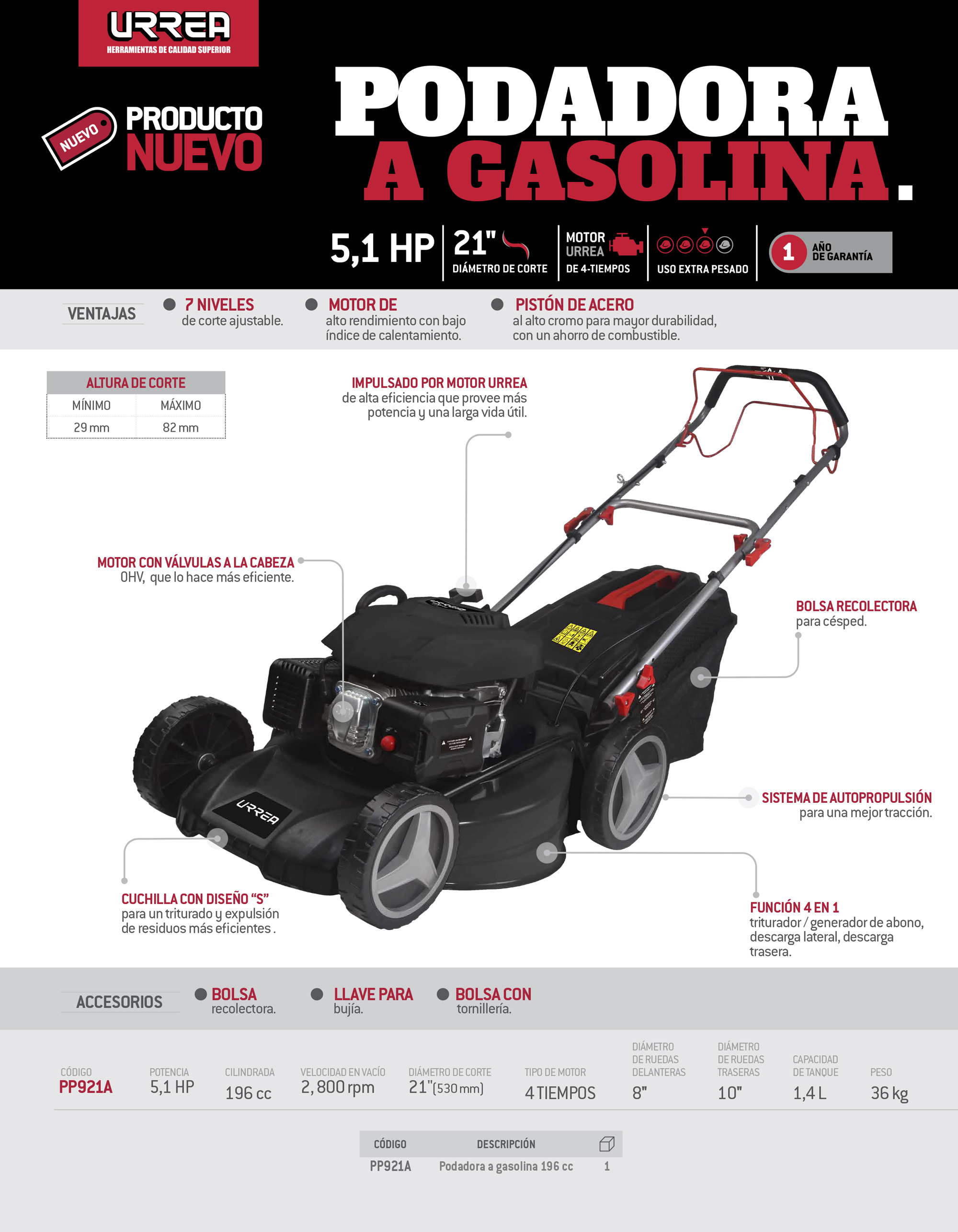 Podadora a gasolina con autopropulsión 21" 196 cc Urrea