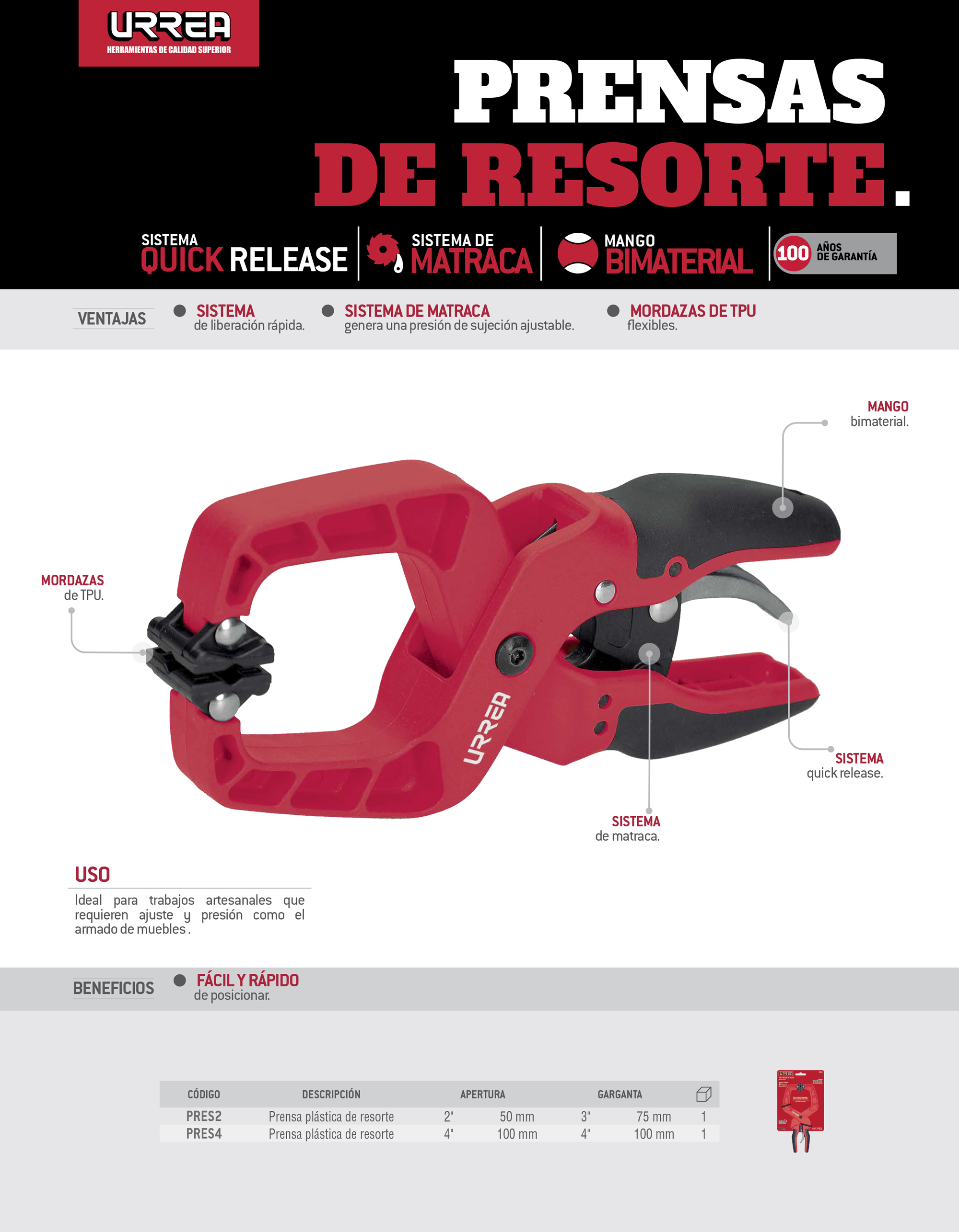 Prensa plástica de resorte 2", Quick Release Urrea