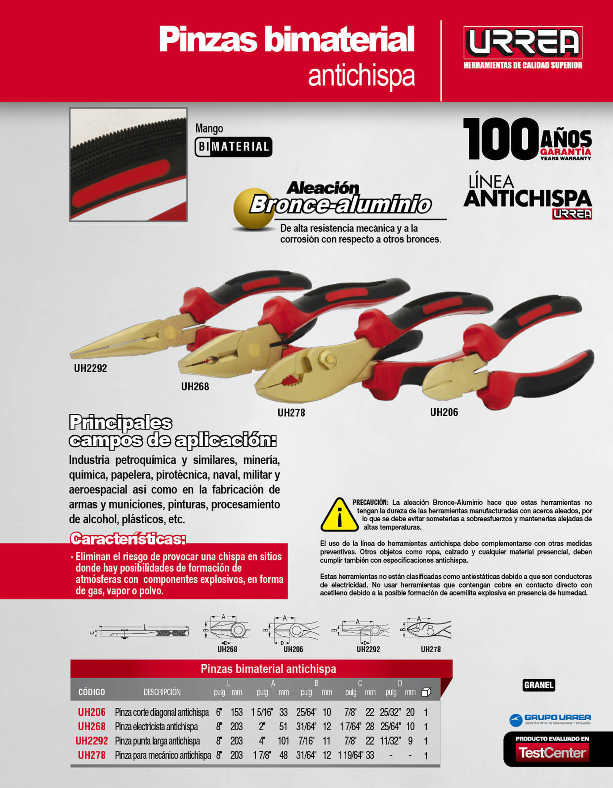 Pinza de bronce-aluminio antichispa con mango bimaterial de 8", para electricista Urrea