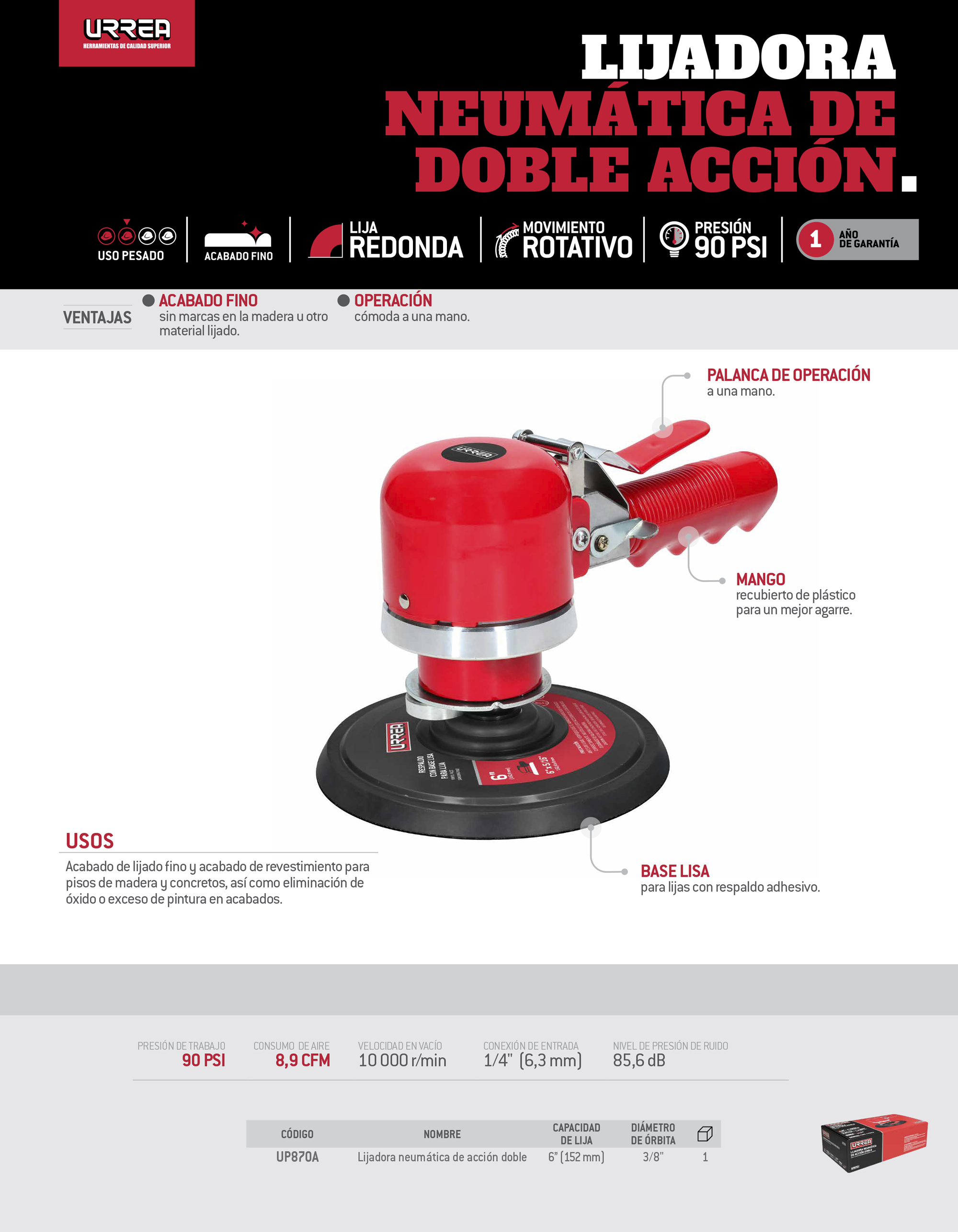 Lijadora neumática acción dual 6" 10,000RPM, eje de 5/16" Urrea