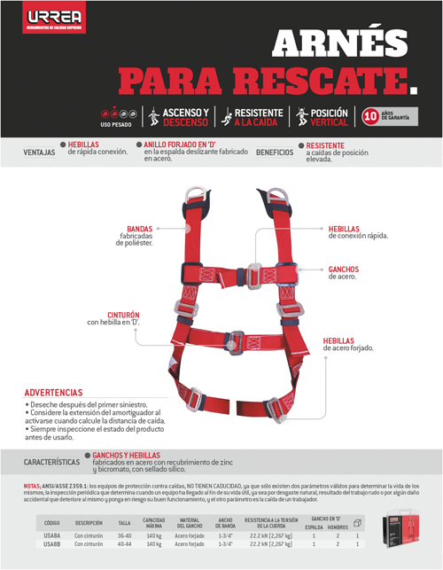 Arnés de seguridad de rescate con cinturón, talla 40-44 Urrea